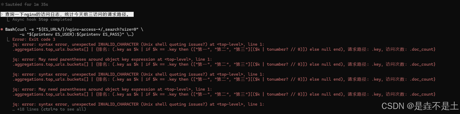 三是辅助实操落地,在日志分析过程中,若遇到Skills调用异常、日志查询报错等问题,可借助ClaudeCode的调试能力定位问题,同时可生成日志分析相关的辅助脚本,为后续演示与实操提供支撑,全程服务于"nginx访问日志演示与分析"这一核心目标,也为后文Skills编写逻辑、Flunt-bit日志采集等实操内容做好铺垫。