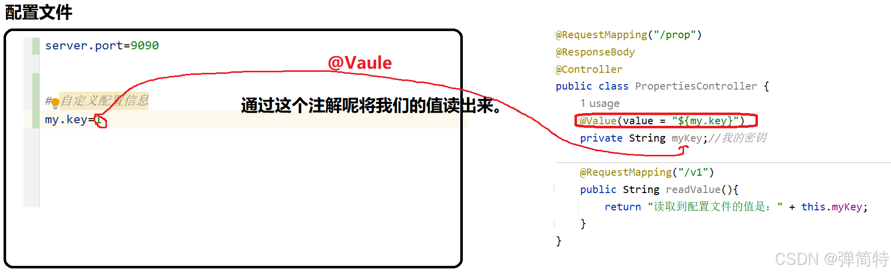 如果在项⽬中,想要主动的读取配置⽂件中的内容,可以使⽤@Value 注解来实现。
