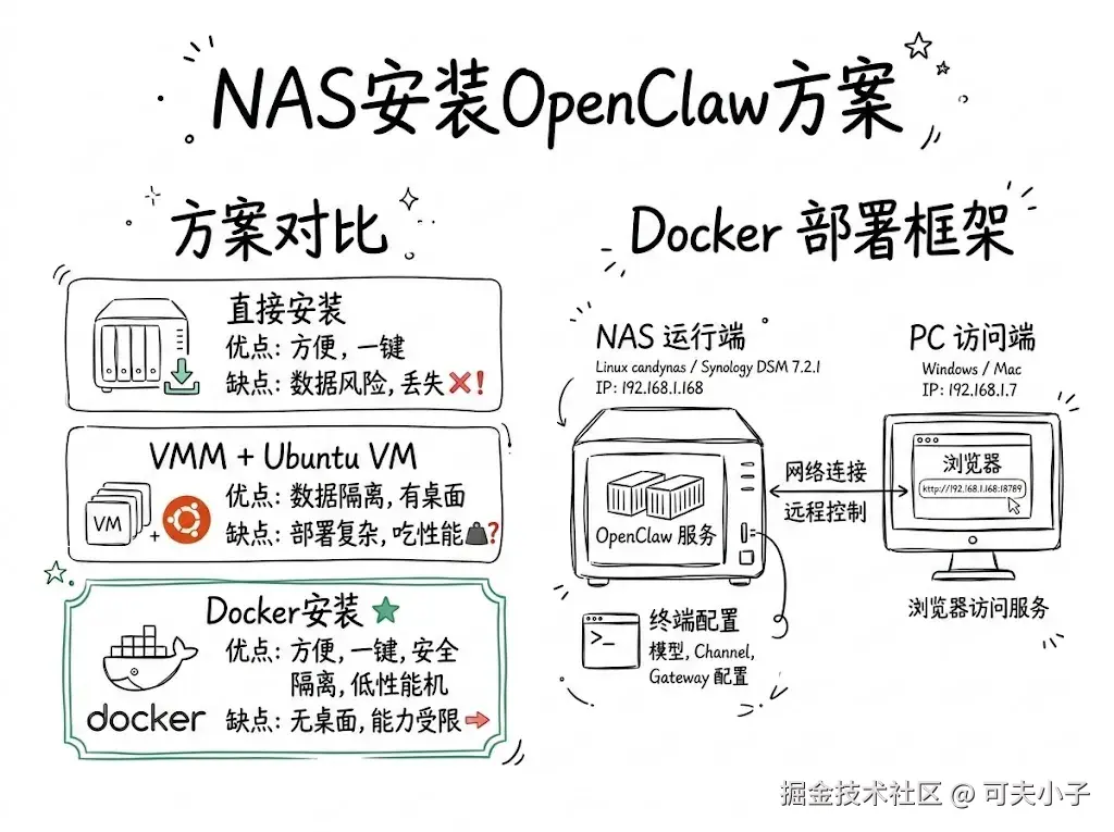 现在市面上的Nas装OpenClaw的教程大多是第2种。但这样比较吃Nas性能,我手头的Nas性能一般。后面我还是选择通过Docker来安装。大概的框架如下