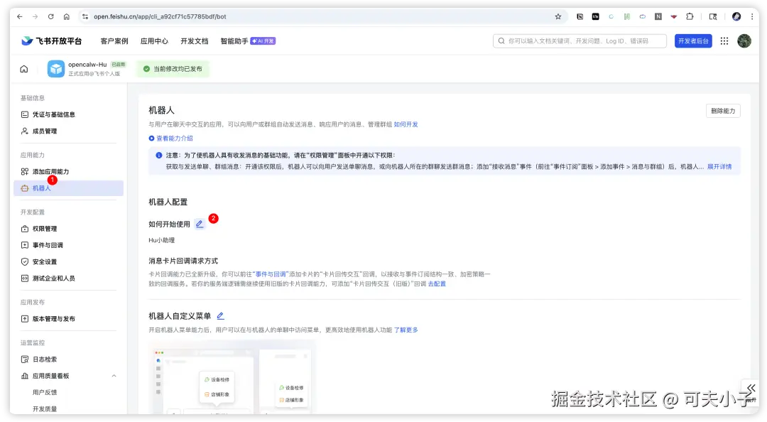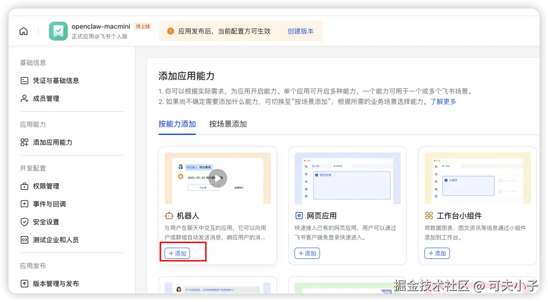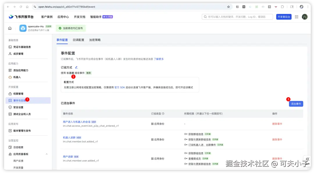 接下来应该要配置事件与回调,但这个先由openclaw先发起来,否则没办法设置。我先发布版本,然后记录下app id和app secret。然后我们又转到Docker的环境里面
