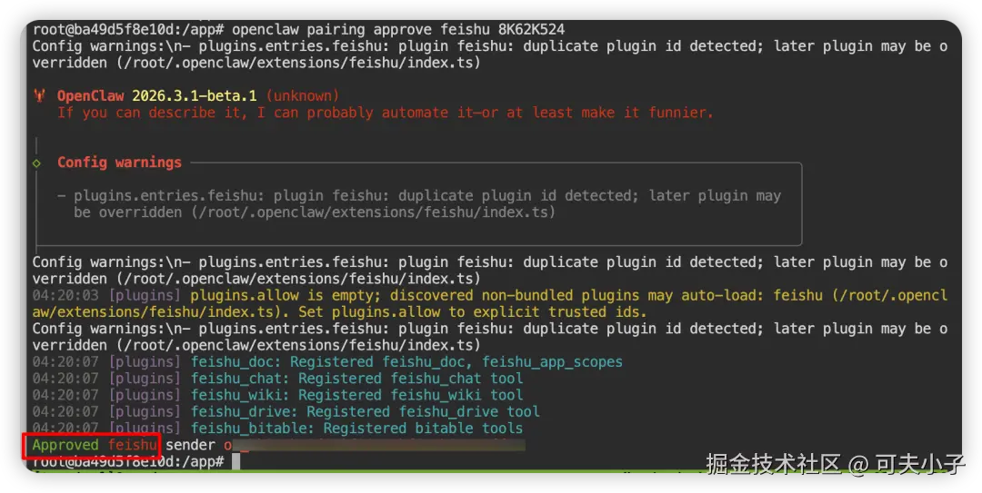 复制这个命令,进入Docker的终端,执行:openclaw pairing approve feishu 8K62K524