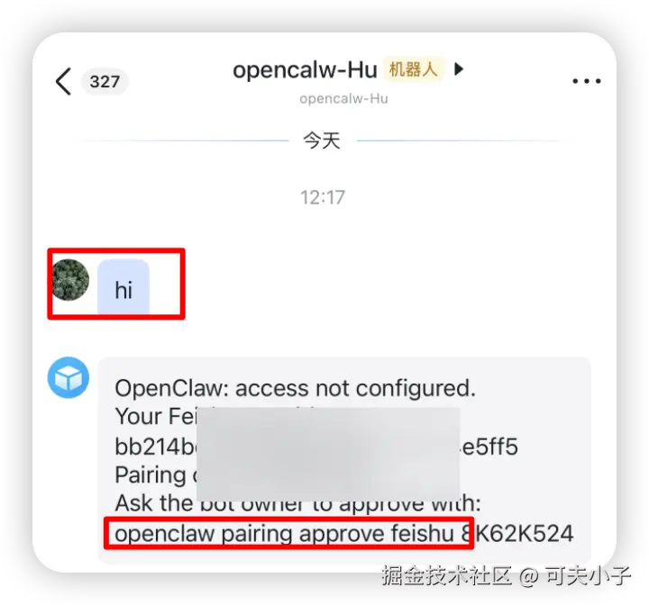 这样两边都配置好,就差最后一步配对。前行在飞书里面发走消息,会提示要求配对,并提供配对命令和配对码