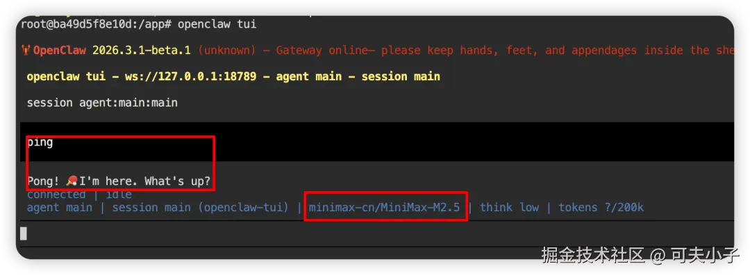 openclaw tui进入openclaw的终端对话框,然后输入任意文本,看大模型是否有回复。