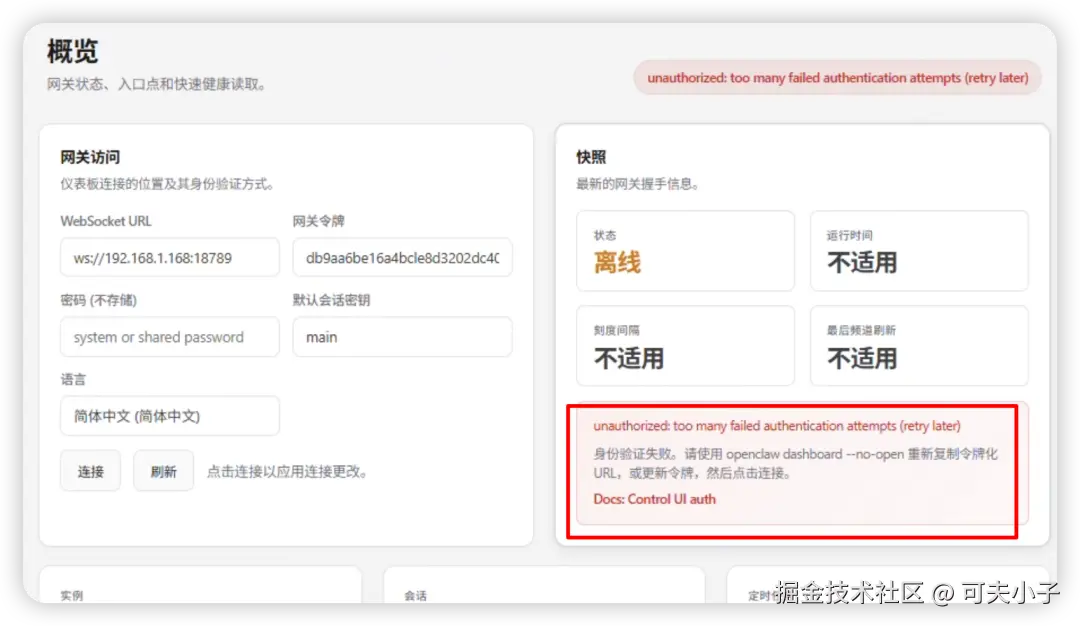身份验证失败。请使用 openclaw dashboard --no-open 重新复制令牌化 URL,或更新令牌,然后点击连接。