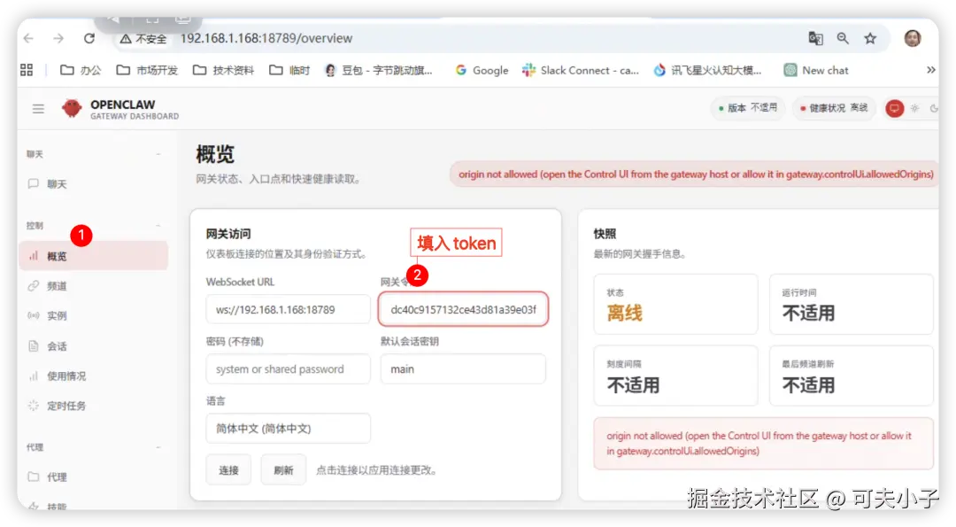 在局域网其他电脑浏览器:http://192.168.1.168.18789,可以看已经看到久违的页面了,但仍然还不是正常对话,第一步先填入token