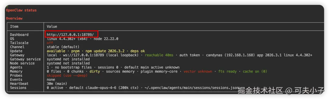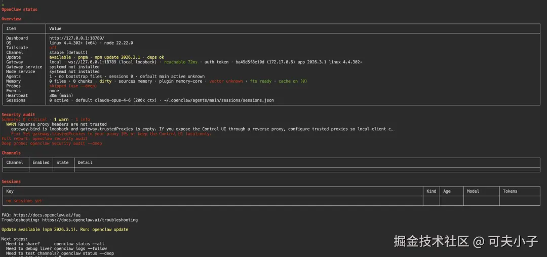 然后再输入openclaw status命令查询一下openclaw的状态,如果能正常打印出来信息,就说明openclaw已经运行起来