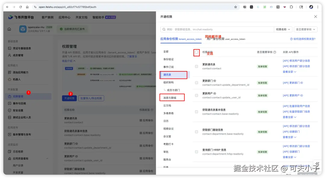 权限这块的坑最多,网上教程大都过时,一些权限都已经改名了,找不到。就我实践来说,主要给「通讯录」和「消息与群组」两大块都授权