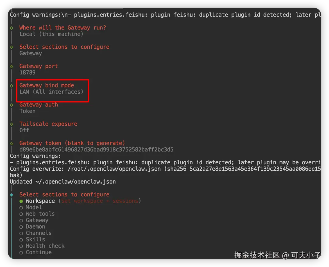 openclaw config,改bind mode为lan模式,如下: