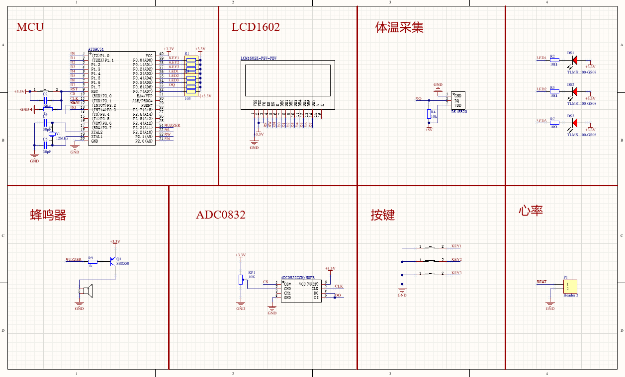 该系统由AT89C51/STC89C52单片机+LCD1602显示模块+血氧传感器(电位器)模块+DS18B20温度传感器模块+按键模块构成。