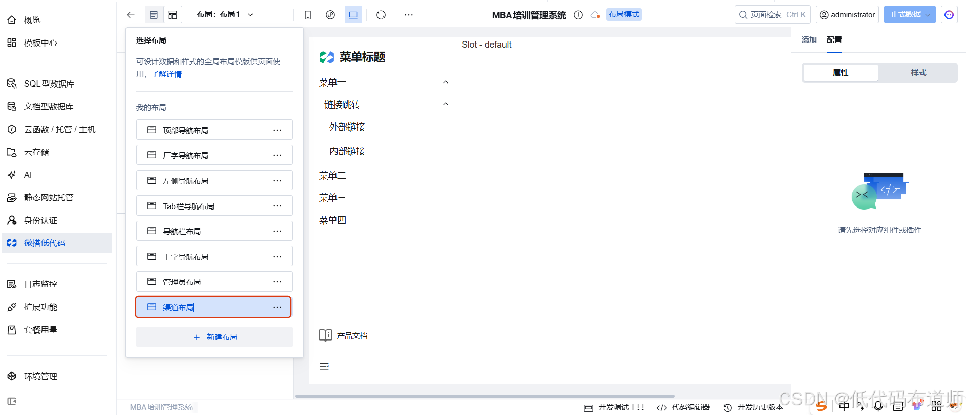 点击创建页面,输入"渠道管理",选择管理员布局。
