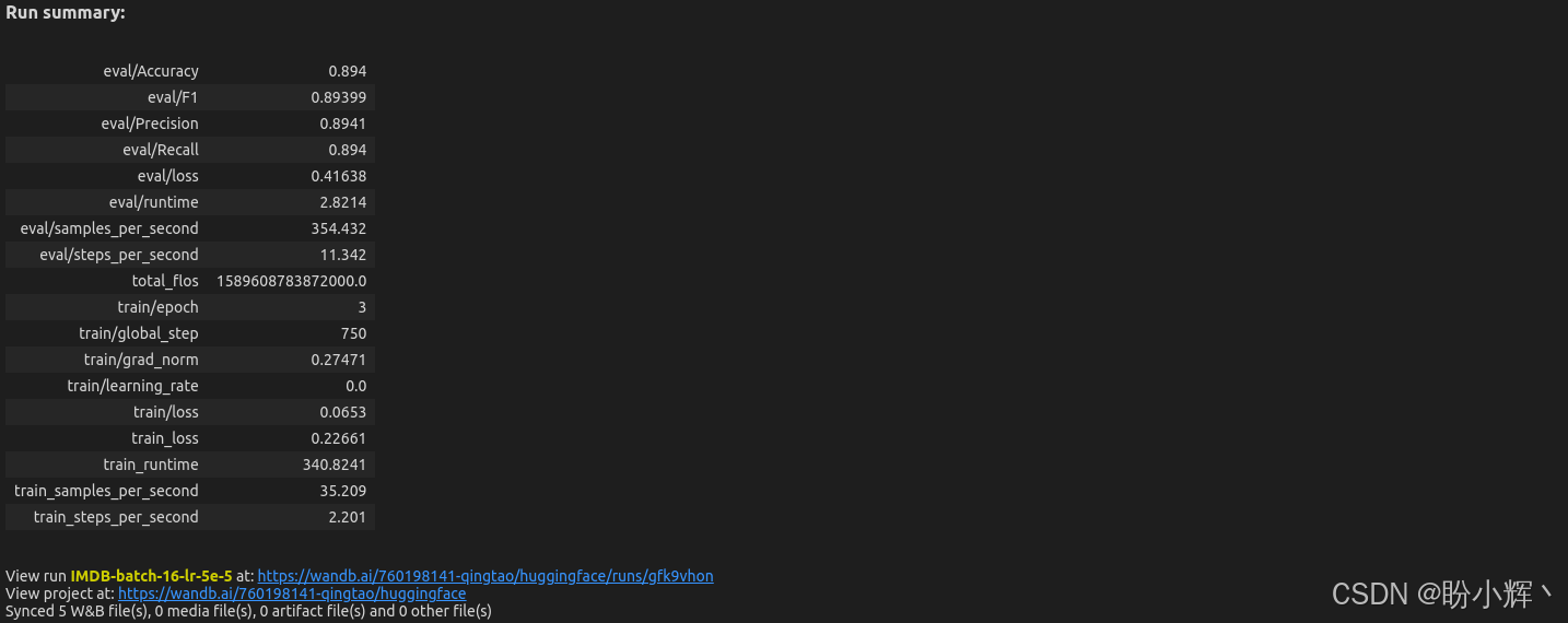 (3) 保持 IMDb 情感分析代码不变,只需向 TrainingArguments 中添加两个参数:report_to="wandb" 和 run_name="...",以启用 W&B 的日志记录功能: