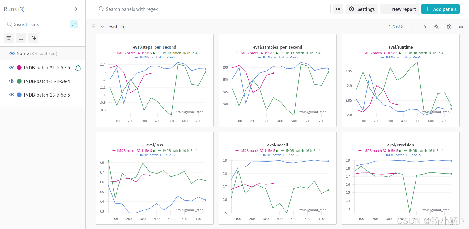 我们只可视化了单次运行的结果,W&B 允许我们动态地同时探索多次运行的结果。例如,我们可以可视化使用不同超参数(如学习率或批大小)的模型结果。为此,我们需要用不同的超参数设置实例化 TrainingArguments 对象,并相应地更改 run_name="..." 来区分每次运行。