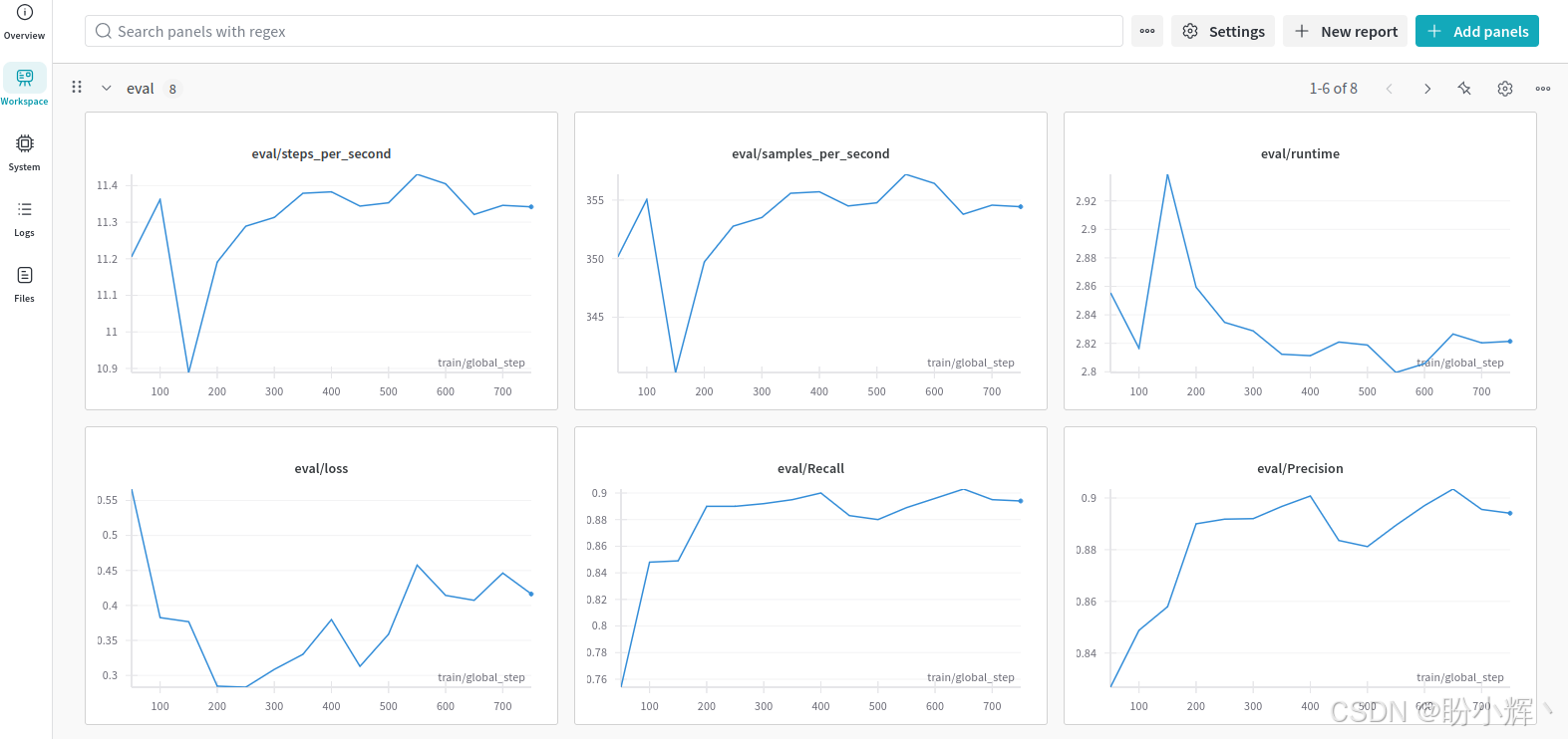 可视化界面为我们提供了单次运行的汇总性能结果。可以看到,我们可以追踪在 compute_metrics() 函数中定义的指标。