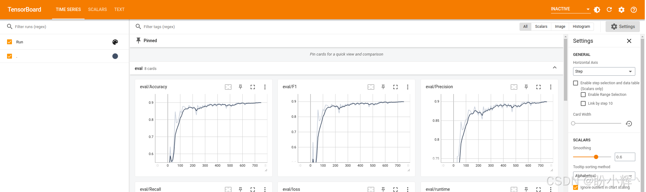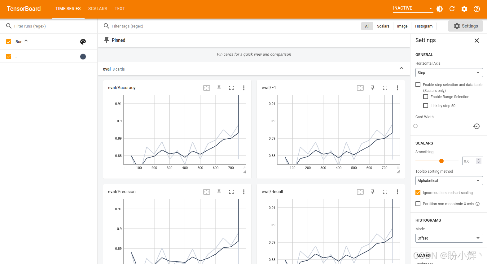 在上图中,我们将 TensorBoard 仪表板左侧的平滑度设置为 0,以便更精确地查看分数并关注全局最小值。如果训练过程波动性较大,平滑功能可以帮助查看整体趋势,它起到移动平均 (Moving Average, MA) 的作用。观察上图可以看到,在第 200 步时最佳模型的损失值为 0.465。