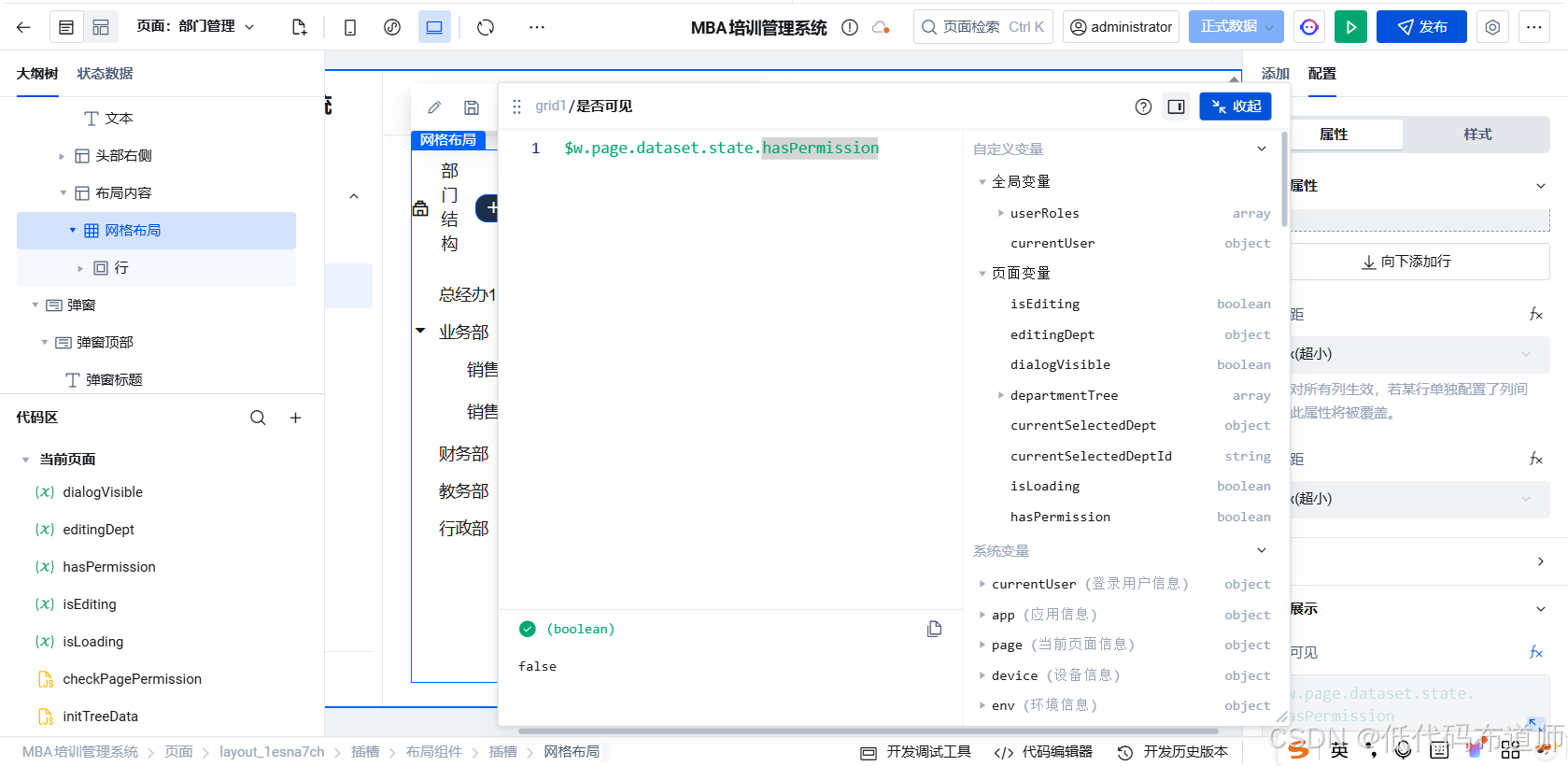 - 在大纲树中,选中包裹你部门管理页面所有核心业务内容的最外层容器网格布局。