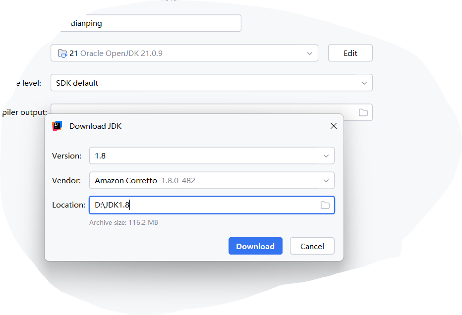 该项目需要JDK的版本必须为1.8,没装JDK1.8的可以直接在IDEA里找到Project Structure选择SDK版本时点击Download下载1.8版本