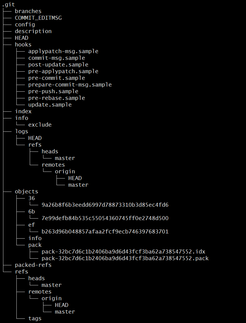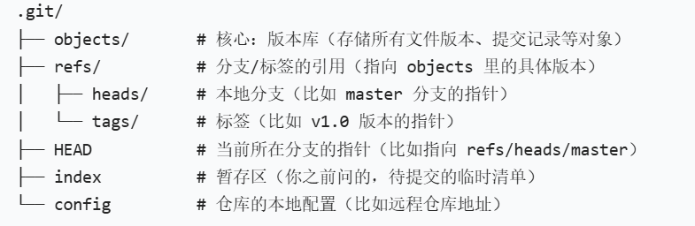 | objects/ | 版本库本体(档案库),所有代码版本、文件内容、提交记录都存在这,是 Git 的核心数据 |