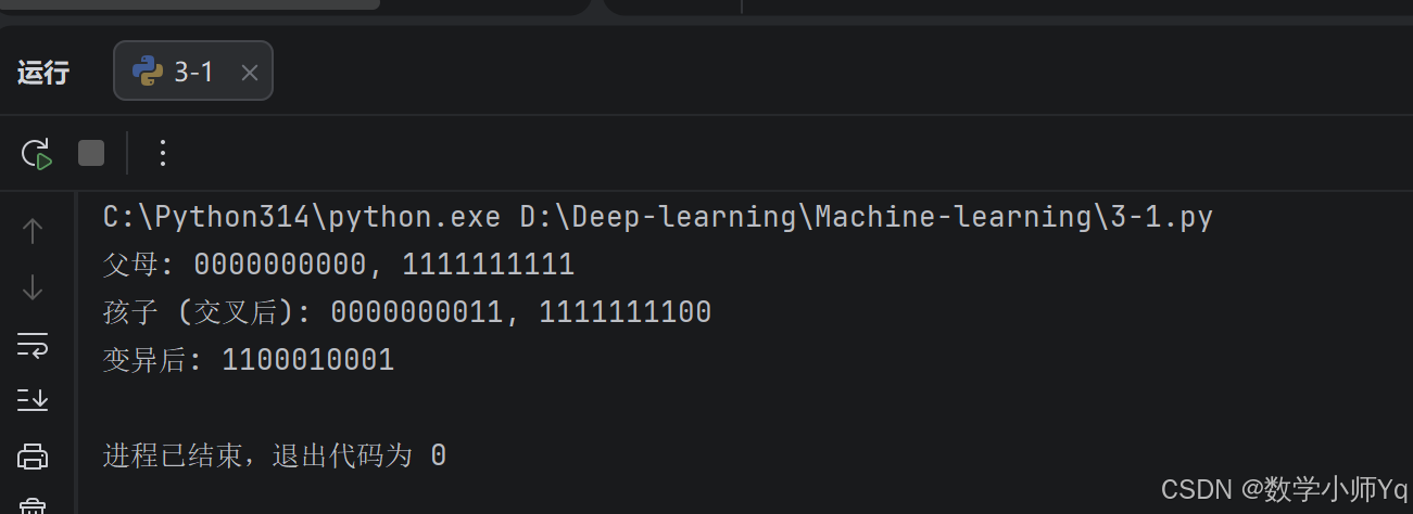# 变异: 遍历每一位,按概率翻转 (0->1, 1->0)