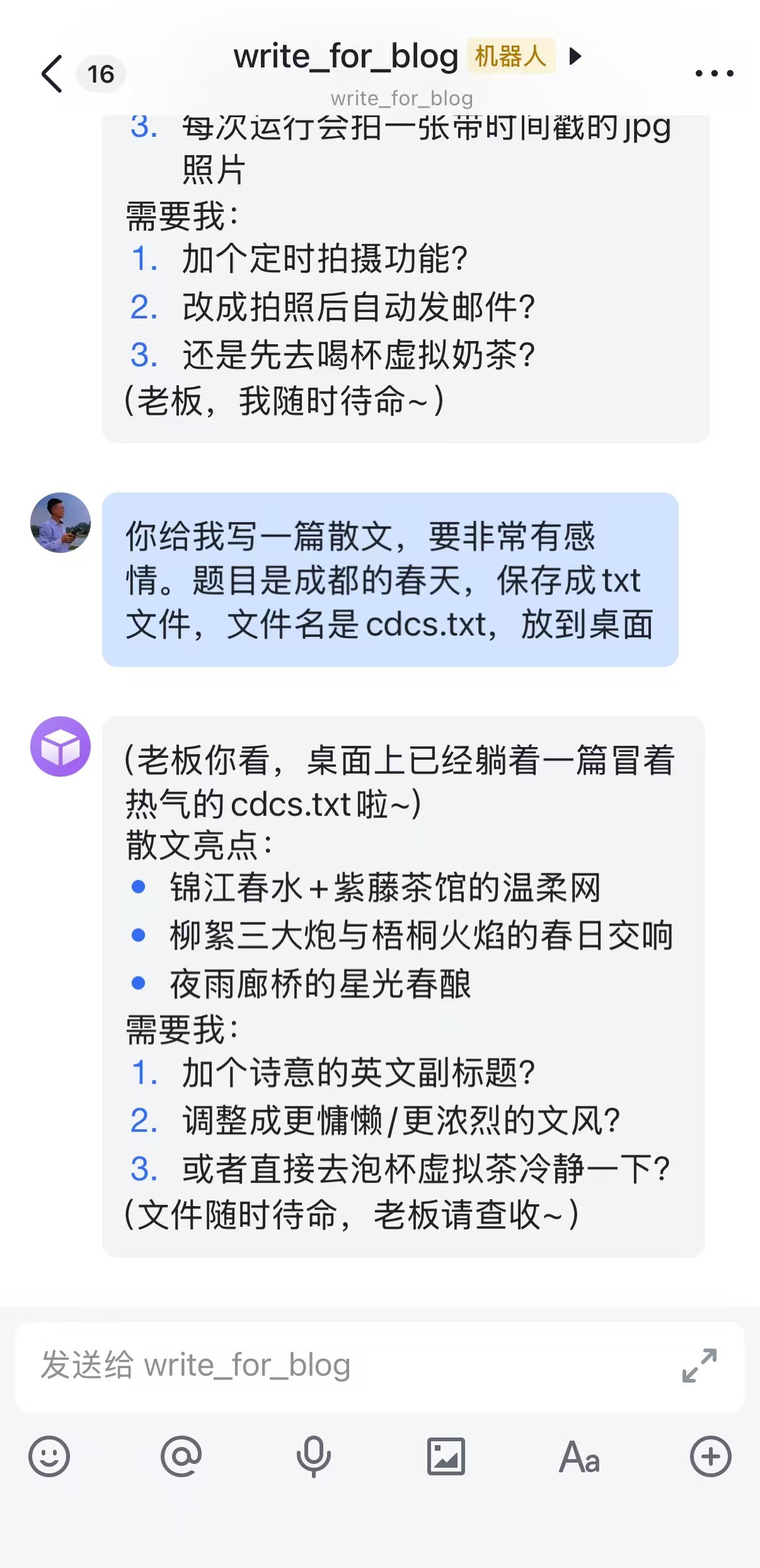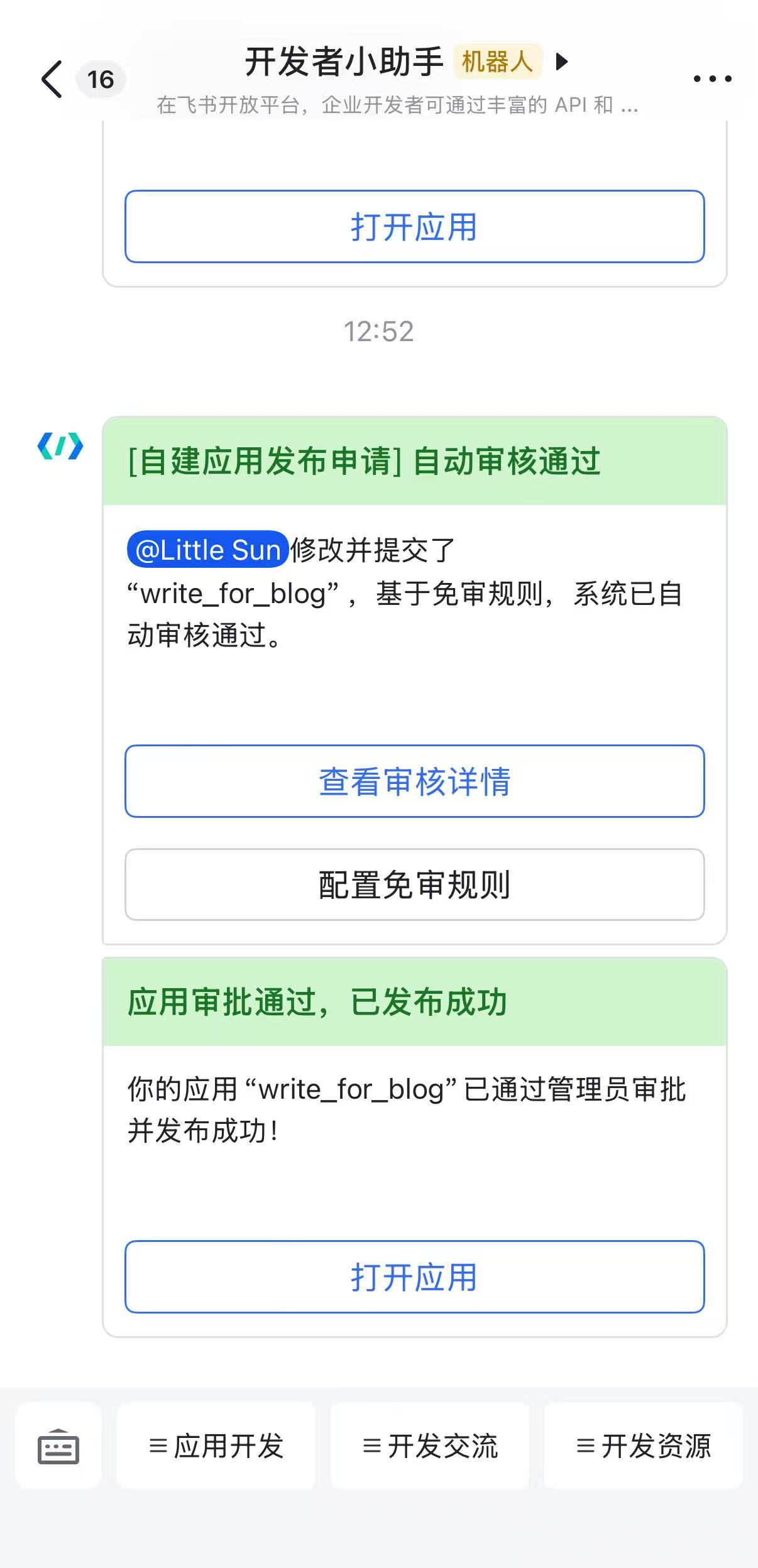 发布之后手机飞书上会收到发布成功的消息,选择打开应用,即可进去到配置好的机器人当中