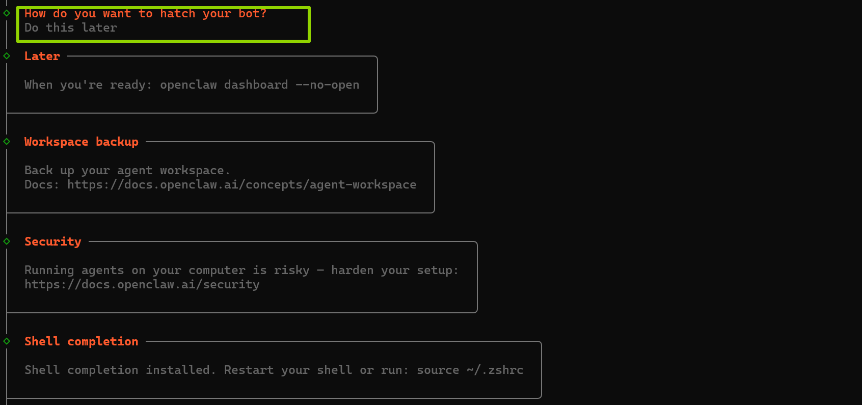 到上面的步骤就 结束了,但是,前面配置飞书的时候出现了异常,在当前终端下,要使用下面的命令来 安装飞书插件: