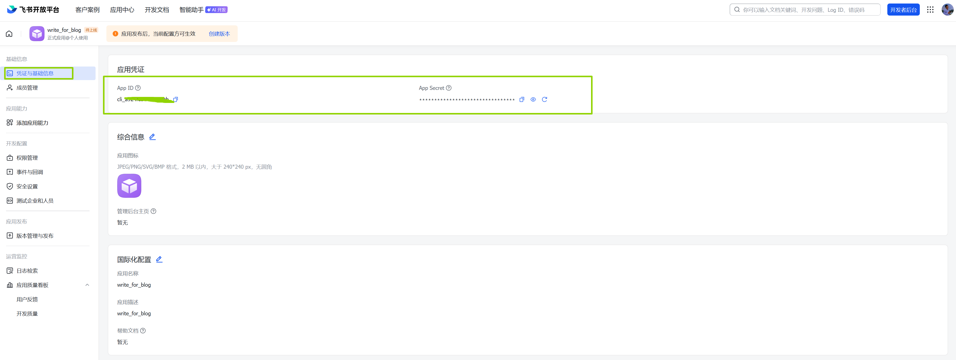 (3)凭证与基础信息中可看到App ID和App Secret