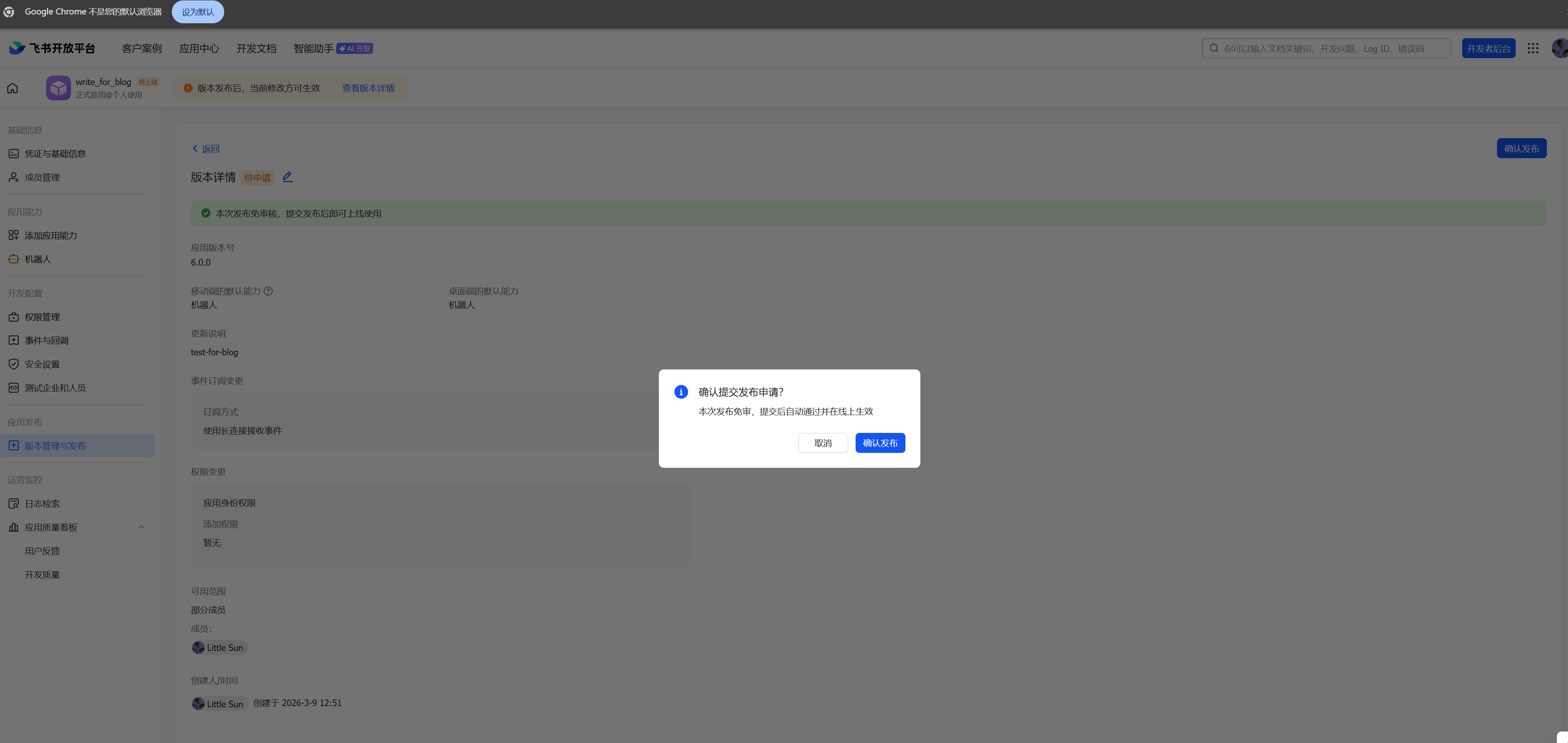点击页面左上方创建版本------填写版本号、更新说明、点击保存、确认发布。