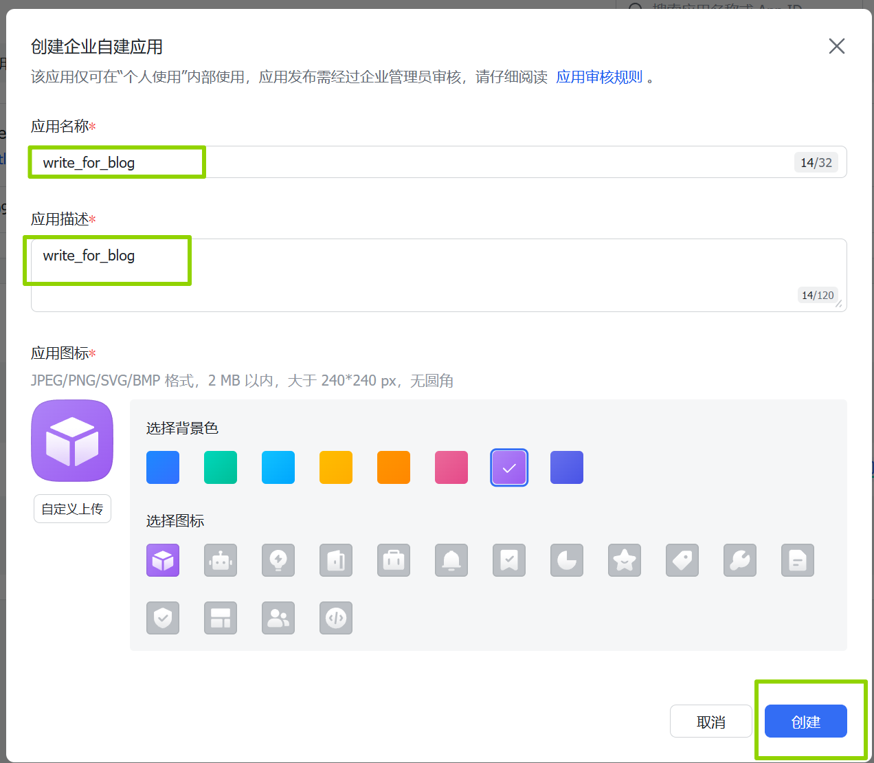 (2)填写应用名称和应用描述,并创建