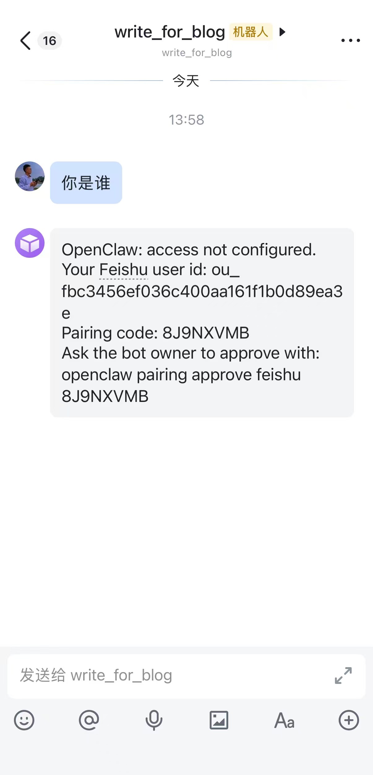 进入后发送消息,你会很惊喜的发现貌似有问题,莫怕,这是因为飞书机器人开启了管理员批准的安全机制,解决方法在后面。
