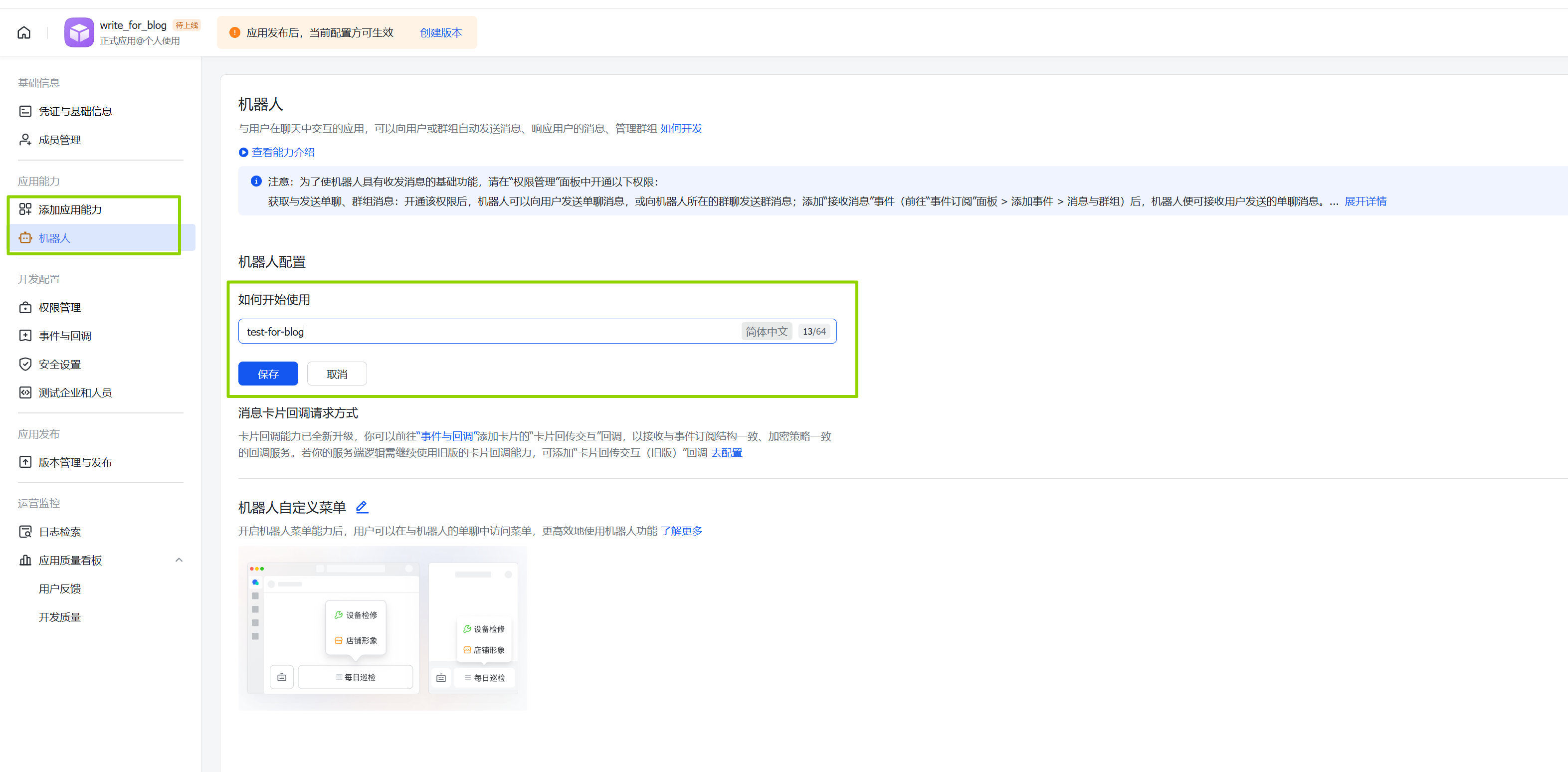 在左侧菜单点击添加应用能力,然后添加机器人。