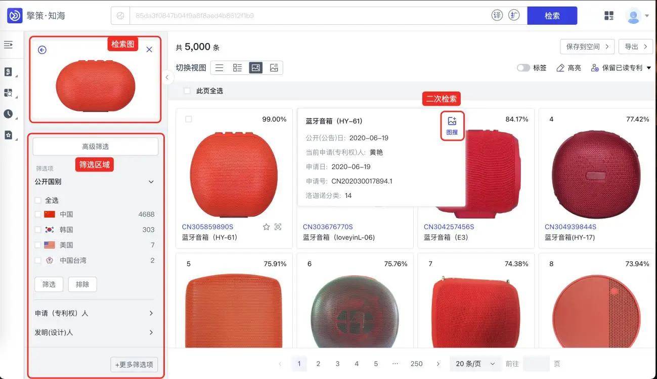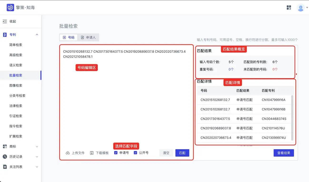 多元技术加持,适配多样化检索场景。擎策·知海的十大专利检索工具依托不同技术支撑,形成互补合力:简单检索搭配热词推荐、中英文互译、智能扩展等功能,实现快速检全,适配快捷检索需求;批量检索支持号码和申请人两种模式,单次可处理1000个申请号/公开号、500个申请人信息,支持多格式分割与号码验证,借助批量处理技术大幅提升检索效率;图像检索利用图像处理和计算机视觉技术,支持外观设计、发明/实用新型图像检索,可实现二次检索,彻底破解图形类专利检索难题;分类号检索支持IPC、CPC等八大分类规则,法律检索聚焦专利法律状态相关信息,引证检索可判断专利技术影响力,扩展检索提升检全率,指令检索支持自定义检索式,全方位覆盖各类检索场景。