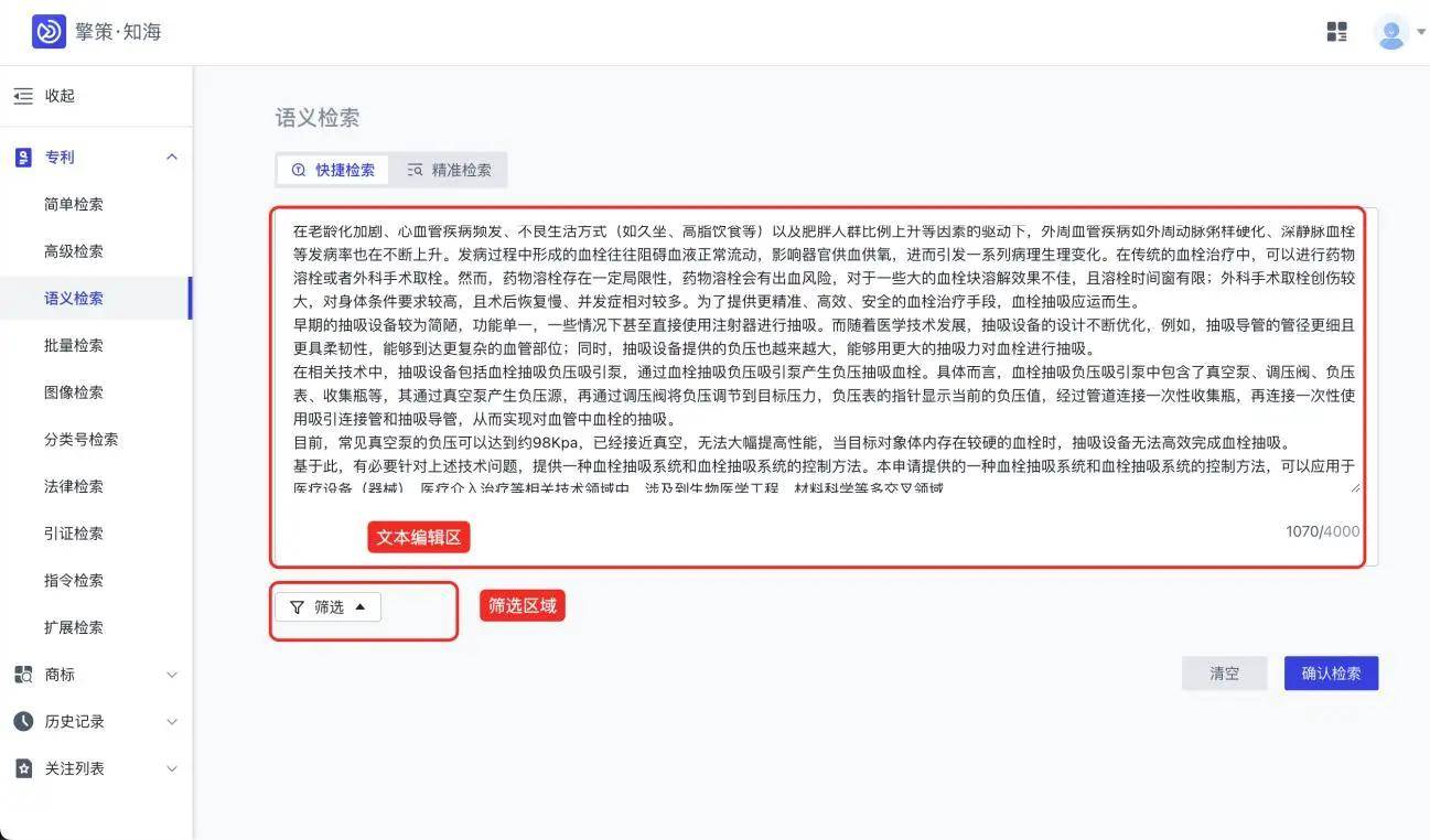 技术赋能精准检索,破解"查不准"难题。擎策·知海依托自然语言处理和机器学习技术,打造语义检索功能,提供快捷检索和精准检索两种模式,用户无需复杂操作,输入自然文本即可实现精准语义匹配,精准检索模式更能自动提取技术领域、技术问题等关键信息,让检索结果与研发需求高度契合;高级检索支持文本、分类号、公司/人、日期等九大维度的组合查询,可自动生成检索式、预览筛选结果,搭配公司树功能(可快速查询申请人股权结构数据),进一步提升检索精准度,帮助科技创新者快速锁定目标专利,剔除无效信息干扰。