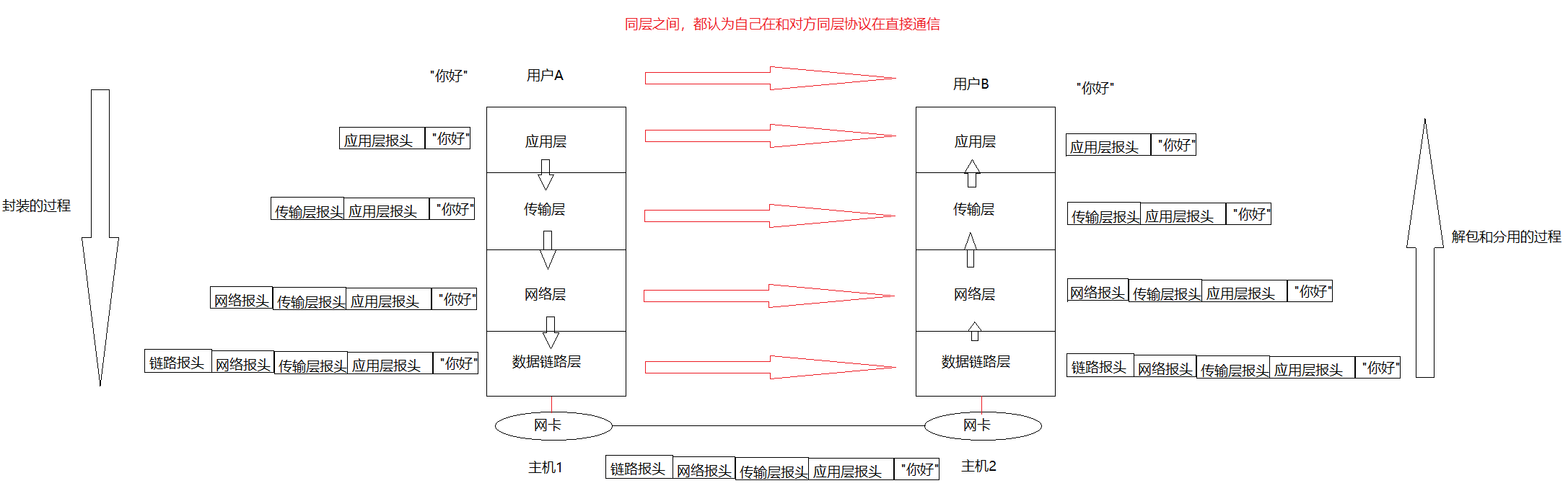 分层的本质,就是模拟每一层只拿到自己这一层数据的场景。 每一层只看到自己的有效数据 + 本层报头,完全看不见上层和下层的细节。而在整个传输过程中,不断地进行报头的封装和解包,从上至下进行封装(报头入栈),从下至上进行解包分用(报头出栈),其过程就是一个入栈出栈的动作,因此有了协议栈的来源。