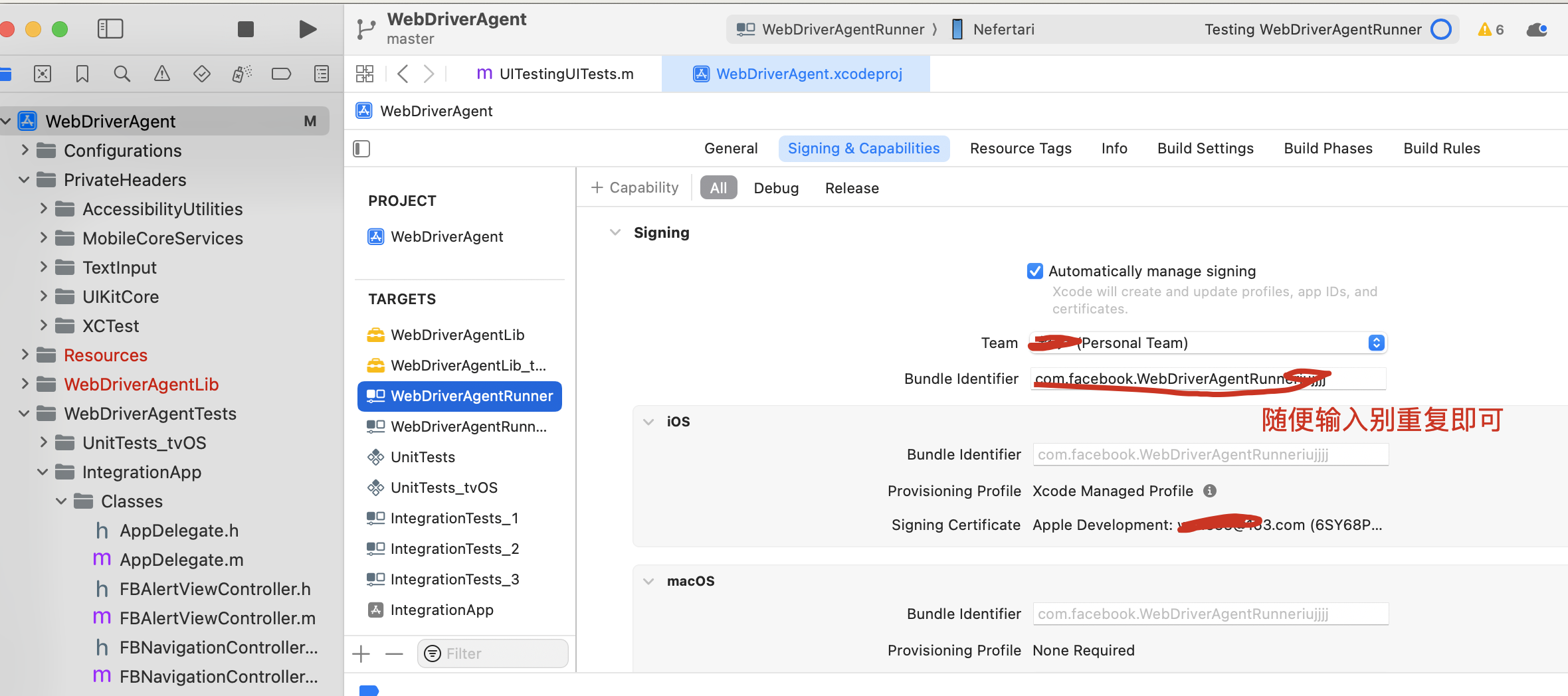 打开Xcode,只开发调试不发布app可通过xcode自动生成开发者证书。选择Team为自己的开发者账号,勾选自动生成开发证书