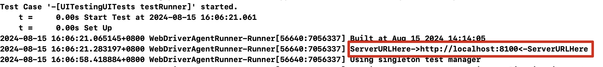在Xcode的log窗口看到的ServerURLHere->http://localhost:8100<-ServerURLHere,可以直接用地址 http://localhost:8100 进行连接,在 AirtestIDE 的设备窗口输入地址,点击连接。(注,远程连接需iOS和Mac在同一个局域网下)