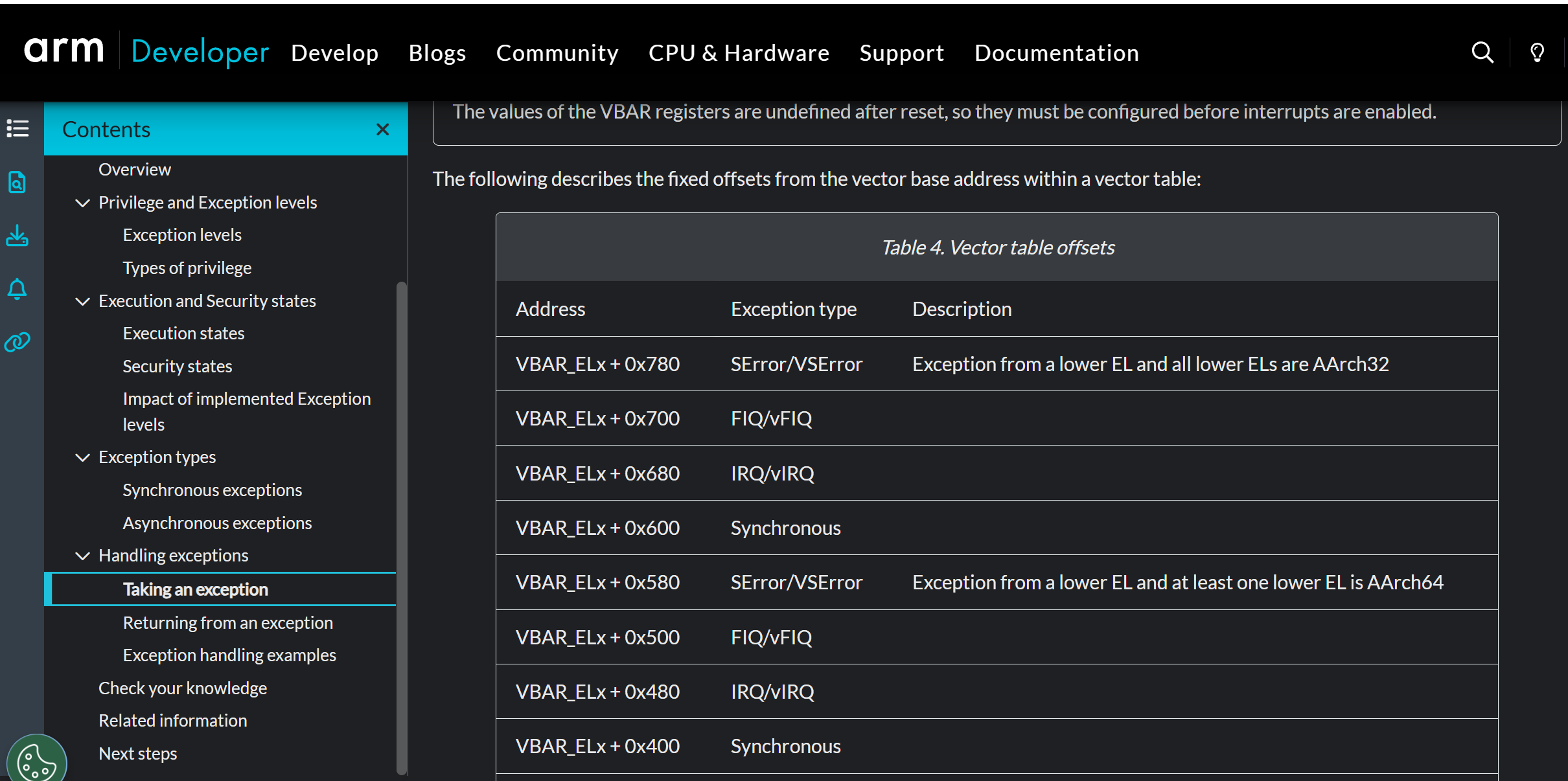 结构: 表被分成了 4 组(对应当前 EL、低级 EL 等),每组包含 4 种异常类型(Synchronous, IRQ, FIQ, SError)。