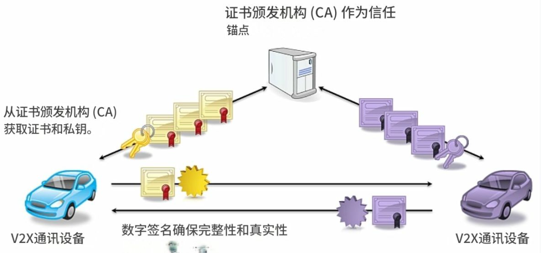 通过应用 PKI 解决方案并使用受信任的证书颁发机构 (CA) 作为基本信任锚,执行 V2X 通信的每个设备都可以安全地从 CA 接收证书和私钥。