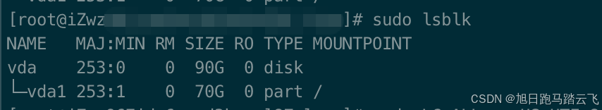 云盘扩容 → 磁盘容量变大(90GB),lsblk 显示70G,df -h 显示70G