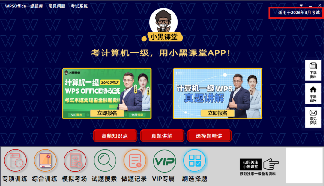**2026年上半年全国计算机等级考试将于3月28-30日举行!**2026年3月最新版小黑课堂计算机一级WPS office题库软件:市面上唯一免费的计算机题库软件,含21套历年真题(新增了2025年新考的一套),有模拟考试和评分功能,和真实考试环境基本一致,考试95%的题目都是题库里面的原题。