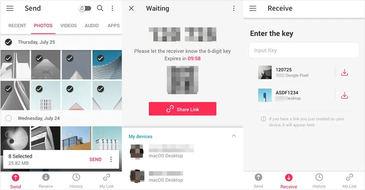 在安卓设备上打开 Send Anywhere 应用,并在"接收"栏输入密钥。照片将立即开始传输。