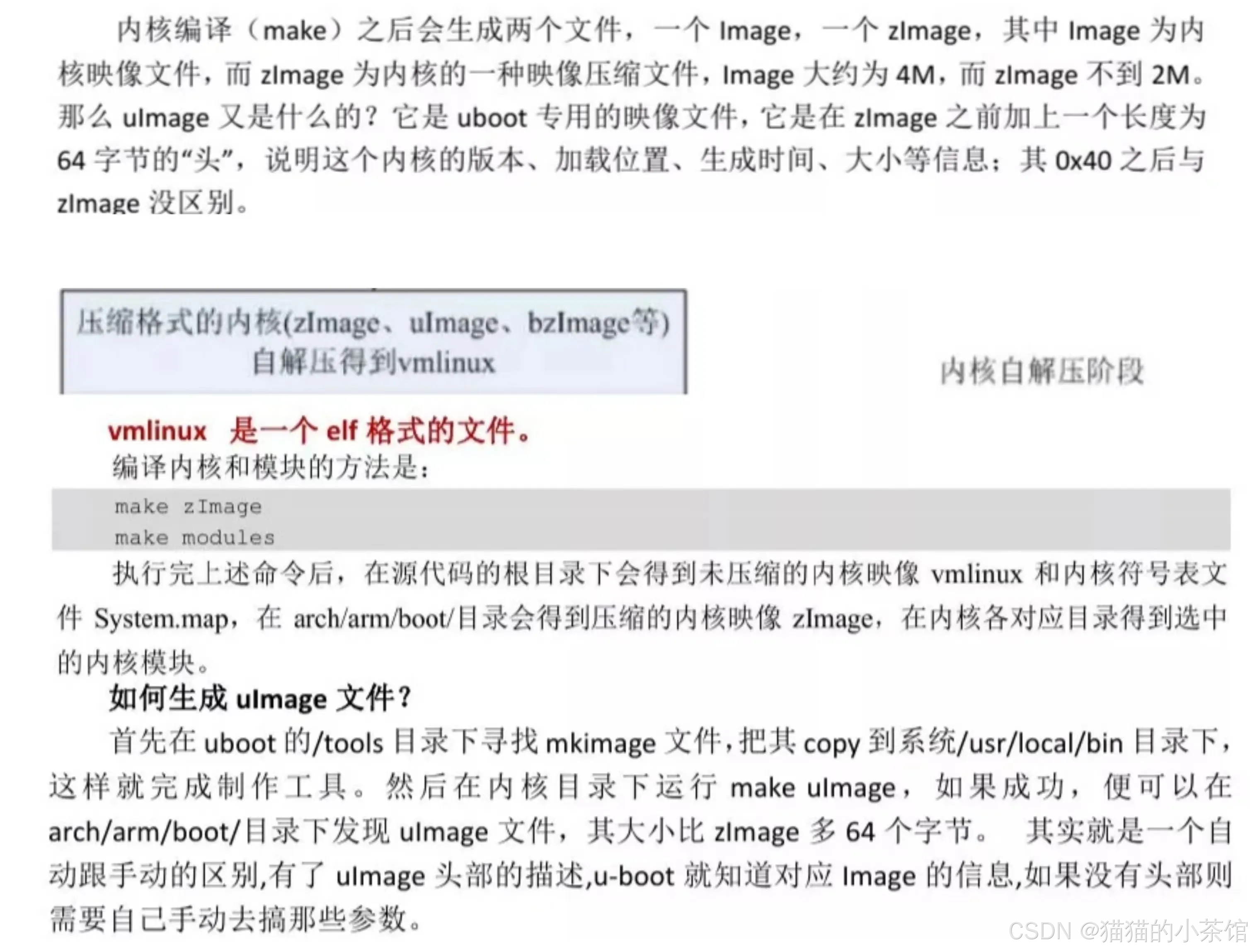 uImage,其内部是 U-Boot 头(64 字节)+zImage,头部包含加载地址、入口地址、校验等元数据,可通过mkimage -l uImage查看。