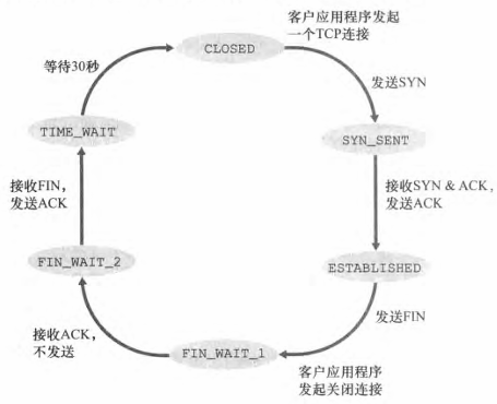 上图说明了客户 TCP会经历的一系列典型 TCP状态。客户 TCP开始时处于 CLOSED (关闭)状态。 客户的应用程序发起一个新的 TCP 连接,这引起客户中的TCP向服务器中的TCP发送一个SYN报文段(并进入了 SYN_SENT 状态)。当客户 TCP处在SYN_SENT状态时,它等待来自服务器TCP 的对客户所发报文段进行确认。当收到服务器的确认报文后, 客户主机则向服务器发送另外一个报文段;这最后一个报文段对服务器的允许连接的报文段进行了确认。客户 TCP进入ESTABLISHED (已建立)状态。当处在ESTABLISHED 状态时, TCP 客户就能发送和接收包含有效载荷数据(即应用层产生的数据)的TCP报文段了。