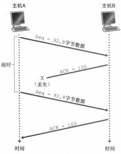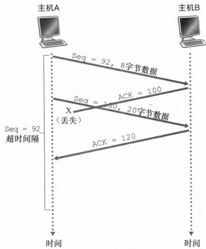 上图描述了第一种情况,主机A 向主机B 发送一个报文段。假设该报文段的序号是92, 而且包含8 字节数据。 在发出该报文段之后,主机A 等待一个来自主机B 的确认号为 100 的报文段。 虽然A 发出的报文段在主机B 上被收到,但从主机B发往主机A 的确认报文丢失了。 在这种情况下,超时事件就会发生,主机A会重传相同的报文段。 当然,当主机B收到该重传的报文段时,会返回一个确认报文。另外,它将通过序号发现该报文段包含了早已收到的数据。 因此,主机B 中的TCP将丢弃该重传的报文段中的这些字节。