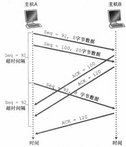 上图描述了第二种情况,主机A 连续发送了两个报文段。 第一个报文段序号是92, 包含8 字节数据;第二个报文段序号是100, 包含20字节数据。 假设两个报文段都完好无损地到达主机B, 并且主机B为每一个报文段分别发送一个确认。 第一个确认报文的确认号是100, 第二个确认报文的确认号是120。 现在假设在超时之前这两个确认报文段中没有一个确认报文到达主机A。 当超时事件发生时,主机A重传序号92 的第一个报文段,并重启定时器。 只要第二个报文段的ACK在新的超时发生以前到达,则第二个报文段将不会被重传。
