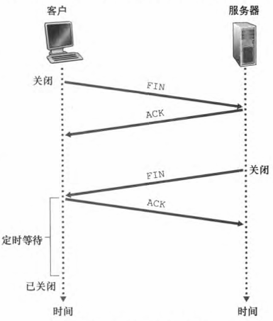 假设客户应用程序决定要关闭该连接。 (服务器也能选择关闭该连接)这引起客户 TCP发送一个带有FIN 比特被置为1 的TCP报文段, 并进入FIN_WAIT_1 状态。 当处在FIN_WAIT_1 状态时,客户 TCP等待一个来自服务器的带有确认的TCP报文段。 当它收到该报文段时,客户 TCP进入FIN_WAIT_2 状态。 当处在 FIN_WAIT_2 状态时,客户等待来自服务器的FIN 比特被置为 1 的另一个报文段; 当收到该报文段后,客户TCP对服务器的报文段进行确认,并进入TIME_WAIT状态。 假定 ACK 丢失, TIME_WAIT 状态使 TCP客户重传最后的确认报文。 经过等待后,连接就正式关闭,客户端所有资源(包括端口号)将被释放。