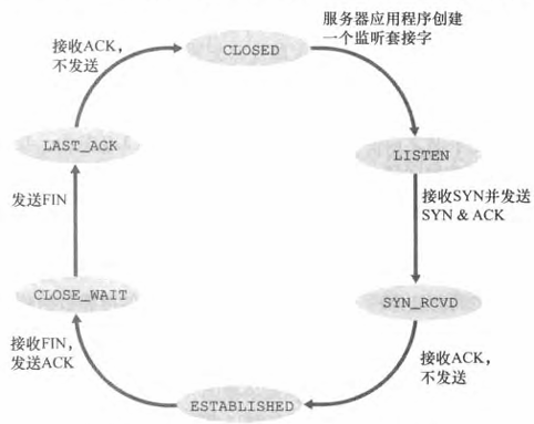 上图说明了服务器端的TCP会经历的一系列典型 TCP状态。在这两个状态变迁图中,我们只给出了TCP连接是如何正常地被建立和拆除的。 我们没有描述在某些不正常的情况下(例如当连接的双方同时都要发起或终止一条连接时)发生的事情。 如果你对此问题及其他与TCP有关的高级问题感兴趣,请自行查阅资料。