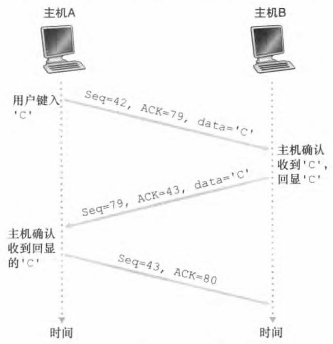 第二个报文段是由服务器发往客户。 它有两个目的: 首先它是为该服务器所收到数据提供一个确认。 通过在确认号字段中填人43, 服务器告诉客户它已经成功地收到字节42及以前的所有字节,现在正等待着字节43 的出现。该报文段的第二个目的是回显字符C。 因此,在第二个报文段的数据字段里填入的是字符'C'的 ASCII 码。 第二个报文段的序号为79, 它是该TCP连接上从服务器到客户的数据流的起始序号,这也正是服务器要发送的第一个字节的数据。值得注意的是,对客户到服务器的数据的确认 被捎带 在服务器到客户的数据报文段中的。