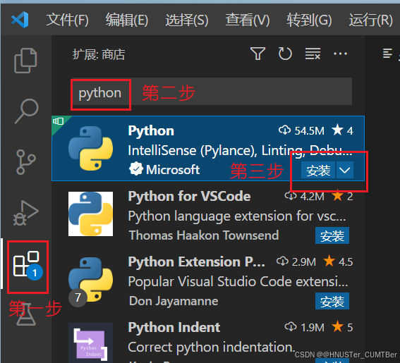 打开Visual Studio Code分别安装两个插件 Chinese 和 Python 等待安装完毕后重启Visual Studio Code。