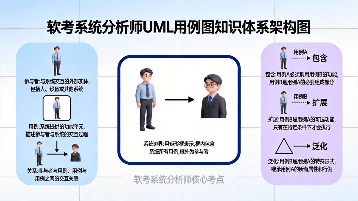 用例图中的关系主要包含三种:包含关系、扩展关系和泛化关系。这是历年考试中最常考的知识点,也是考生最容易混淆的地方。