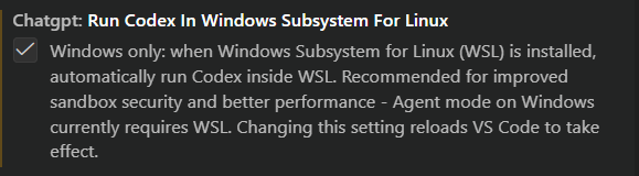 仅 Windows 系统适用,若安装了 Windows Subsystem for Linux(WSL),可自动在 WSL 中运行 Codex,提升沙盒安全性和性能,且当前 Windows 上的代理模式需要 WSL,修改此设置需重启 VS Code 生效。