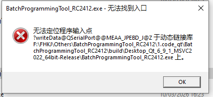 2、qt的release版本执行时报错:无法定位程序输入点?writeData@QSerialPort@@MEAA_JPEBD_J@Z于动态链接库F:\FHK/\Others\BatchProgrammingTool_RC2412\1.code_qt\BatchProgrammingTool_RC2412\build\Desktop_Qt_6_9_1_MSVC2022_64bit-Release\BatchProgrammingTool_RC2412.exe 上.,但是debug版本可以正常运行